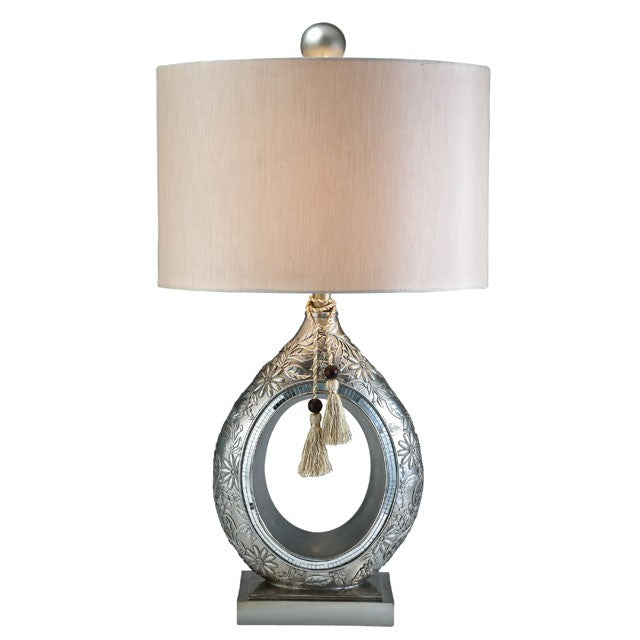 A chrysanthemum embroidered design wraps around this stunning table lamp with a unique shape. Mirror strips trim the edges for an upscale look.