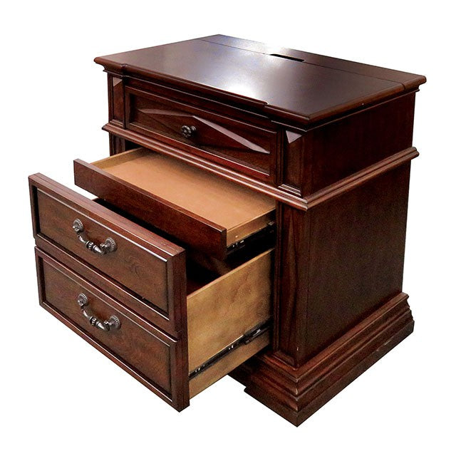 This transitional night stand will look great in any bedroom space looking to add a bit of pizazz. A cherry finish along with wood carving designs will add character to your room and provide ample storage space for clothes, magazines and other home items.