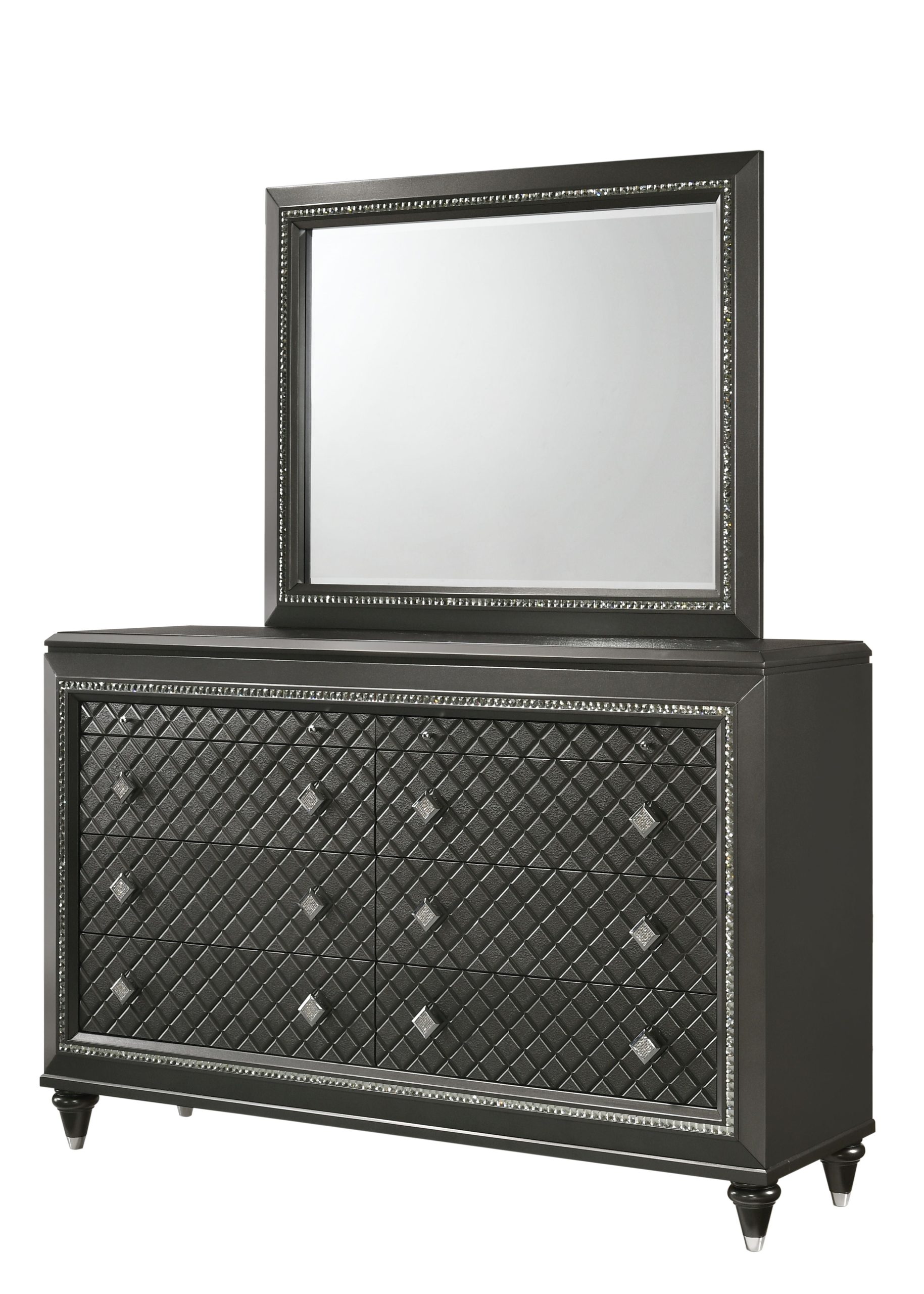 Features Giovani Collection Upholstered headboard Diamond shaped drawer pulls Shiny silver accents Contemporary style Grey Finish Included: B7900-Q Queen Bed (headboard, footboard, side rails) B7900-2 Night Stand B7900-1 Dresser B7900-11 Mirror Optional: B7900-K King Size Bed B7900-2 Night Stand B7900-4 Chest B7900-94 Bench Dimensions: Queen Size Bed: 70″ W 97″ D 41.5″ H Dresser: 65″ W 17.5″ D 40.8″ H Mirror: 46.8″ W 1.4″ D 36.4″ H Nightstand: 29.6″ W 17.5″ D 28″ H King Size Bed: 83.5″ W 87.5″ D 72.5″ H Chest: 39.3″ W 17″ D 50″ H Bench: 53.9″ W 18.1″ D 18.9″ H