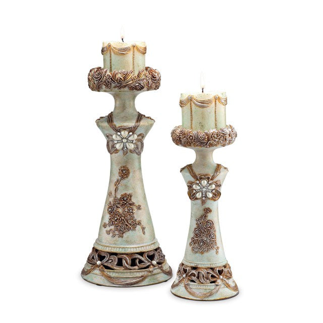 This classic candle holder set features rose, swag, and bow design accents with a soft celadon finish.