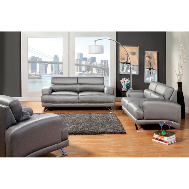 Add a touch of modern to your living room with this spectacular set. Low arms and plush cushions offer comfort, while the uniquely-shaped chrome legsand T-cushions seating deliver a sense of style. A lustrous silver leatherette material tops this chic look.