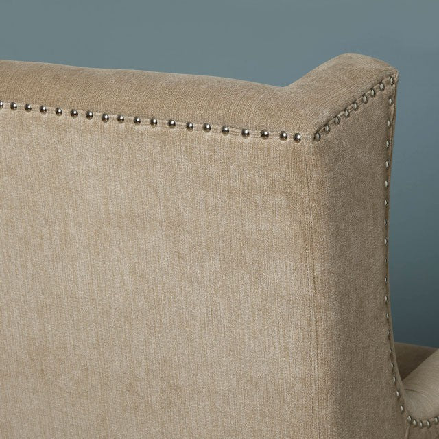 Cuddle up to this accent chair. The nailhead trim accentuates the wingback design while smooth fabric offers cushioned comfort. Available in gray or ivory.