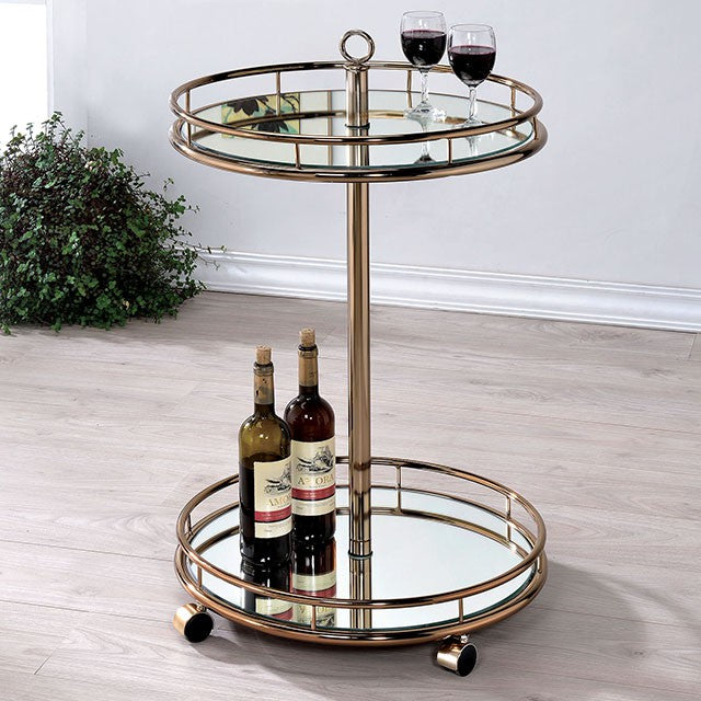 Stylishly designed for the chic contemporary home. This slender champagne finished Serving Cart is constructed with a dual tiered serving shelf, and eye-catching mirrored panels to enhance the display of glasses or drink ware.